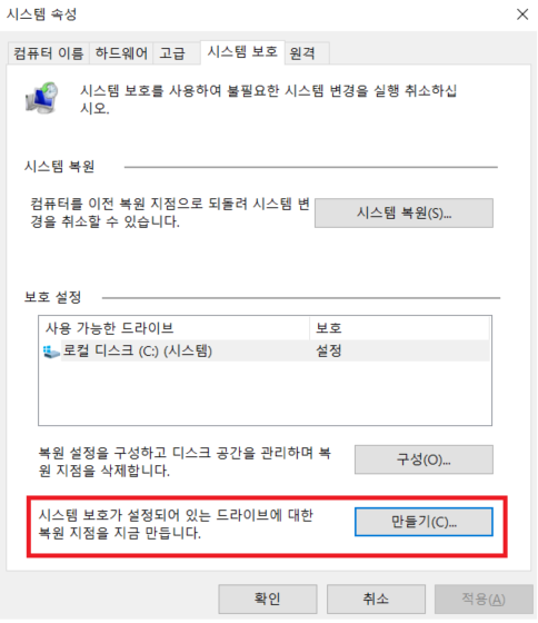 윈도우10 복구 및 시스템 복원 지점 만들기