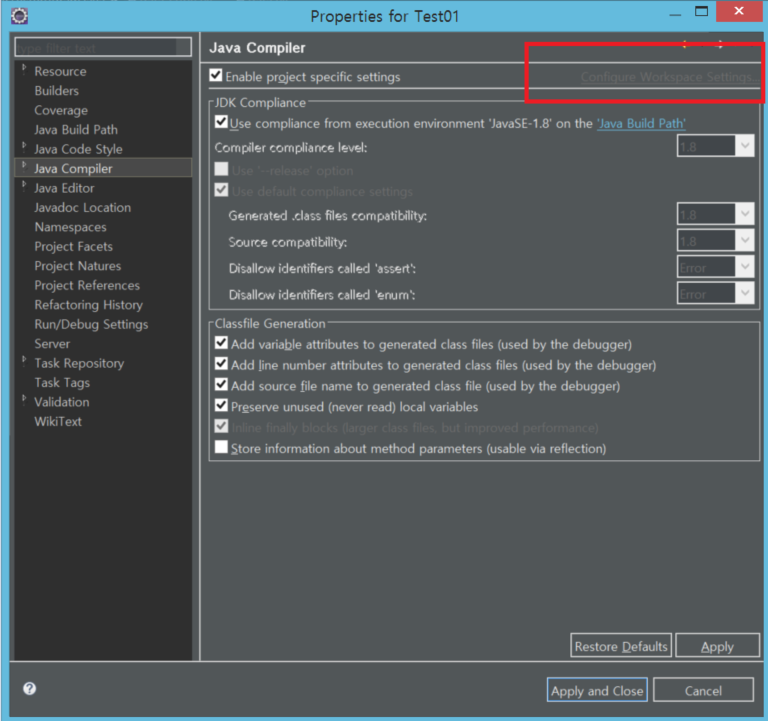 이클립스의 전체적인 환경설정에 설정되는 Java Compiler와