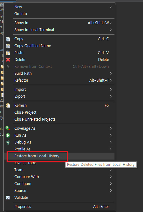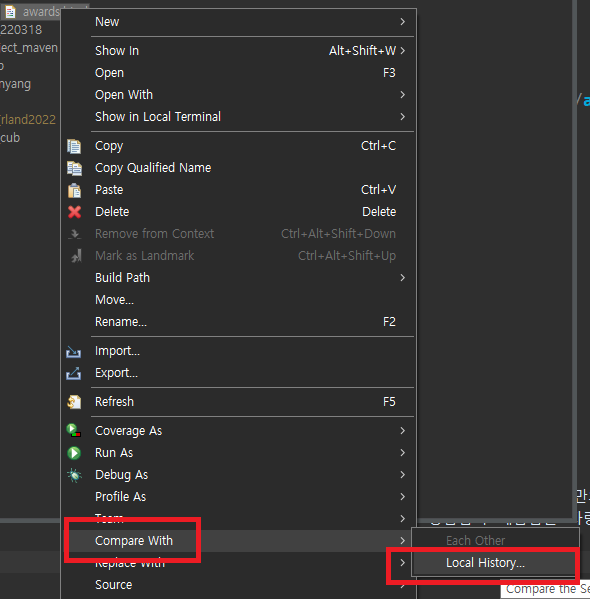 해당파일 마우스 우클릭 > Compare With > Local History 에서 로컬 히스토리 내역을 확인할 수 있다 ㅠㅠ 꿀팁