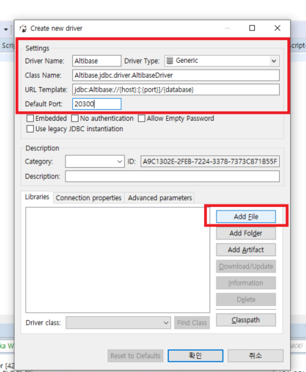 - URL Template : jdbc:Altibase://{host}[:{port}]/{database}