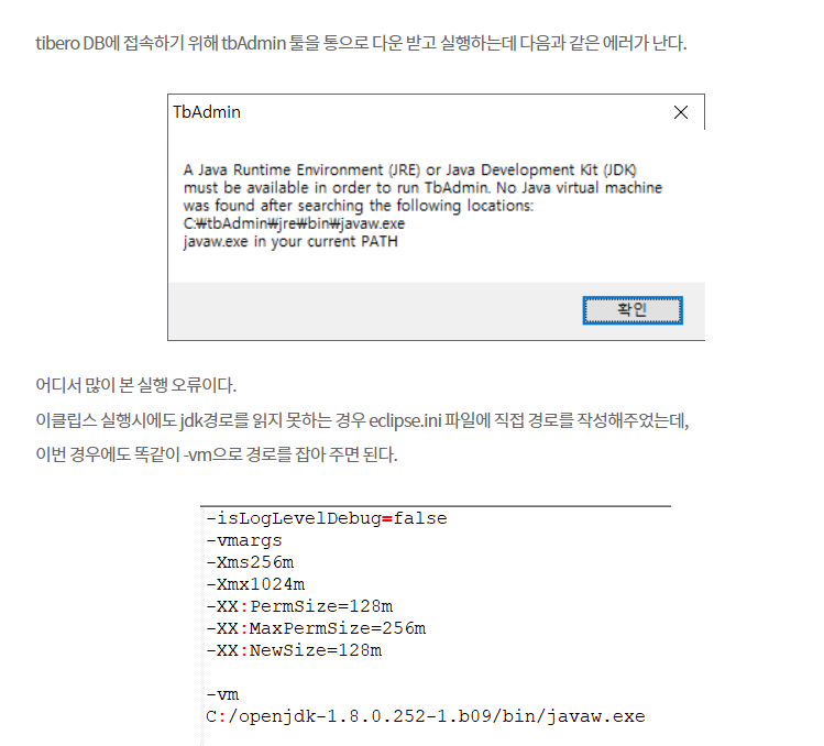 개발관련/error [tibero error]fail to load the jni shared library Josiah 2022. 7. 26. 15:26 728x90 https://tysoso.tistory.com/27 [tbAdmin] tbAdmin 실행 오류(tbAdmin.ini) [tbAdmin] tbAdmin 실행 오류(tbAdmin.ini) tibero DB에 접속하기 위해 tbAdmin 툴을 통으로 다운 받고 실행하는데 다음과 같은 에러가 난다. 어디서 많이 본 실행 오류이다. 이클립스 실행시에도 jdk경로를 읽 tysoso.tistory.com 공유하기 게시글 관리 시작해보겠습니다. 저작자표시 비영리 변경금지 (새창열림) '개발관련 > error' 카테고리의 다른 글 java.lang.ClassNotFoundException / Cannot load JDBC driver class 'oracle.jdbc.driver.OracleDriver' (0) 2022.08.08 Caused by: java.lang.ClassNotFoundException: org.apache.catalina.startup.Bootstrap (0) 2022.08.07 [MariaDB10 error]java.sql.SQLException: Unknown system variable 'OPTION' / 드라이브 교체하면 해결 (0) 2022.07.26 [Dbeaver > sybase]JZ006: IOException 발견: java.io.IOException: JZ0TS: Dbeaver 7.1.0 - SQLEditor <Script -1.sql> 전송 시도 중 잘림 오류 발생 / jar파일 변경할 것 (0) 2022.07.11 [db2] 명령행 환경이 초기화되지 않았습니다. (0) 2022.06.27 '개발관련/error' Related Articles java.lang.ClassNotFoundException / Cannot load JDBC driver class 'oracle.jdbc.driver.OracleDriver' Caused by: java.lang.ClassNotFoundException: org.apache.catalina.startup.Bootstrap [MariaDB10 error]java.sql.SQLException: Unknown system variable 'OPTION' / 드라이브 교체하면 해결 [Dbeaver > sybase]JZ006: IOException 발견: java.io.IOException: JZ0TS: Dbeaver 7.1.0 - SQLEditor <Script -1.sql> 전송 시도 중 잘림 오류 발생 / jar파일 변경할 것