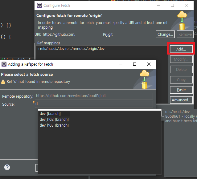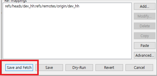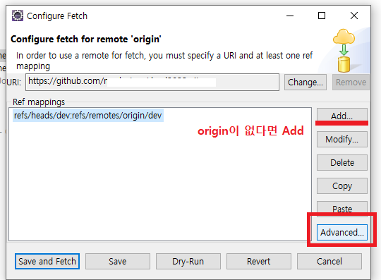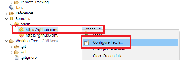Remotes 부분을 열어서 Remotes -> origin 에서 마우스 우클릭 Configure Fetch