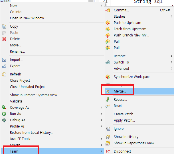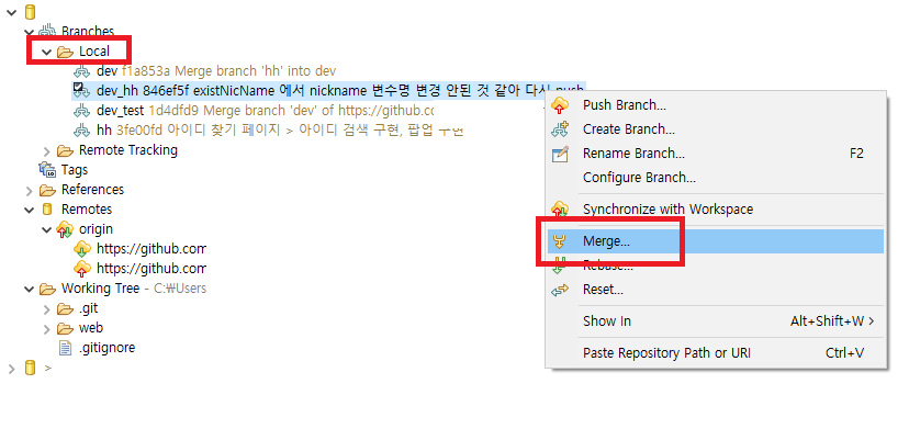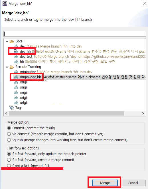 remote 에 해당하는 branch 를 선택 후 merge 한다.