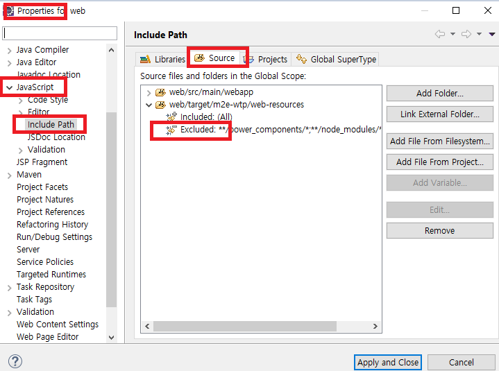 프로젝트 우클릭 > Properties > JavaScript > Include Path > Source 탭 으로 들어가서