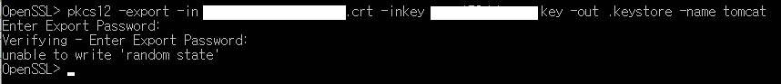 pkcs12 -export -in private.crt(인증서이름) -inkey private.key(인증서키이름) -out .keystore -name tomcat