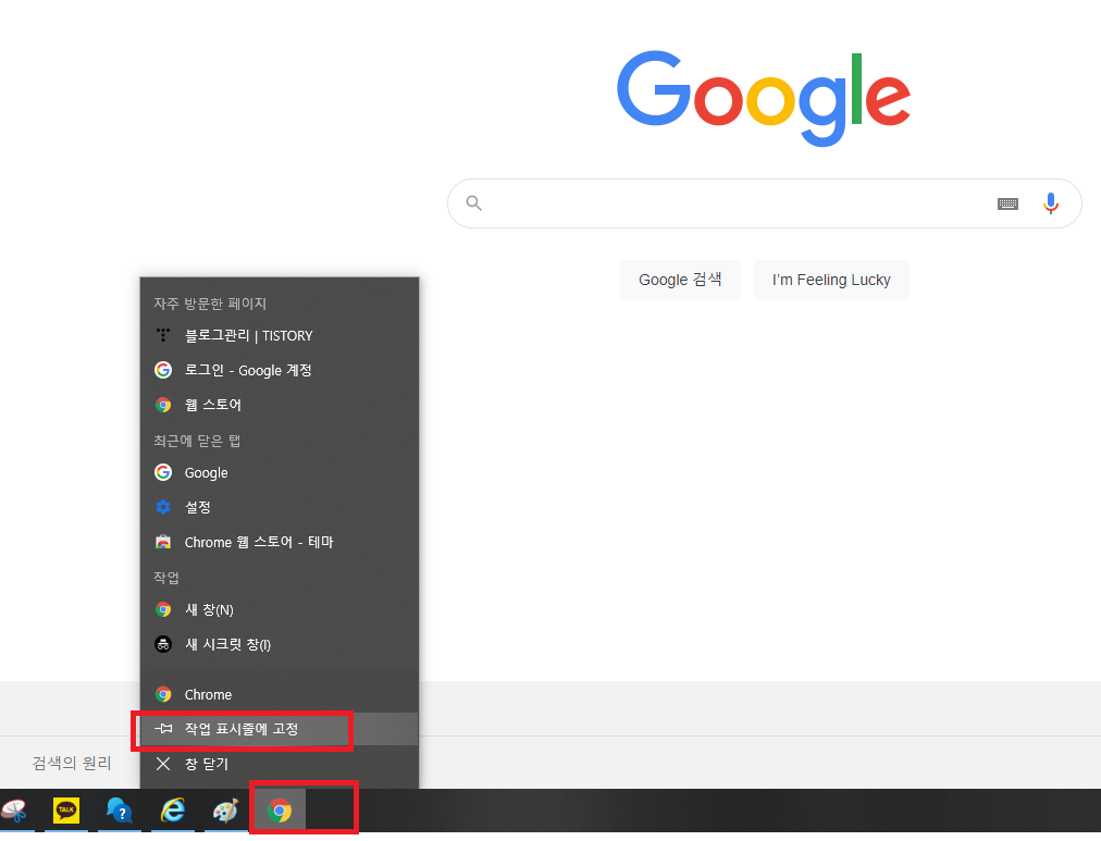 해당 열고있는 크롬 아이콘 클릭 후 작업표시줄에 고정하기 선택하면 된다.