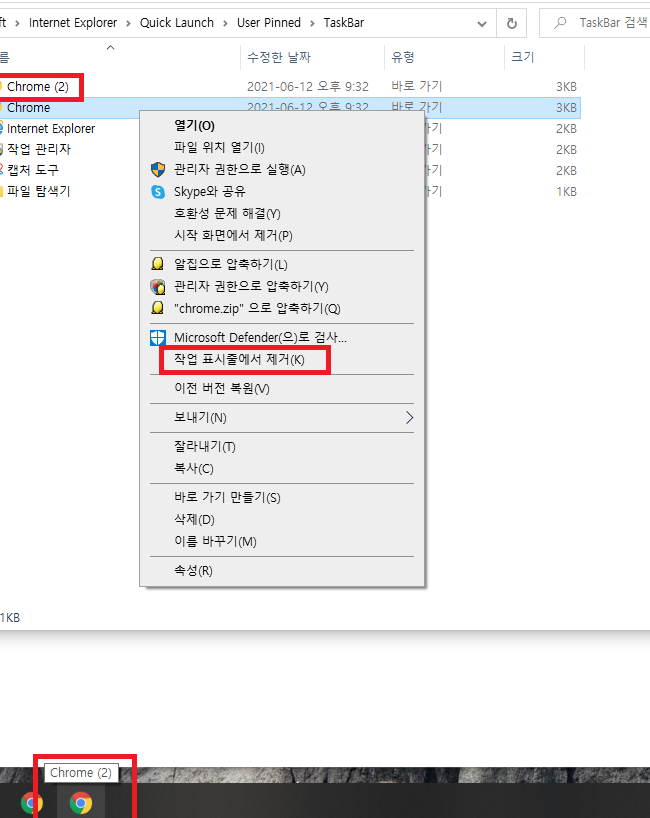 다음과 같은 경로에서 작업표시줄로 추가하면 Chrome(2) 바로가기가 생성되면서
